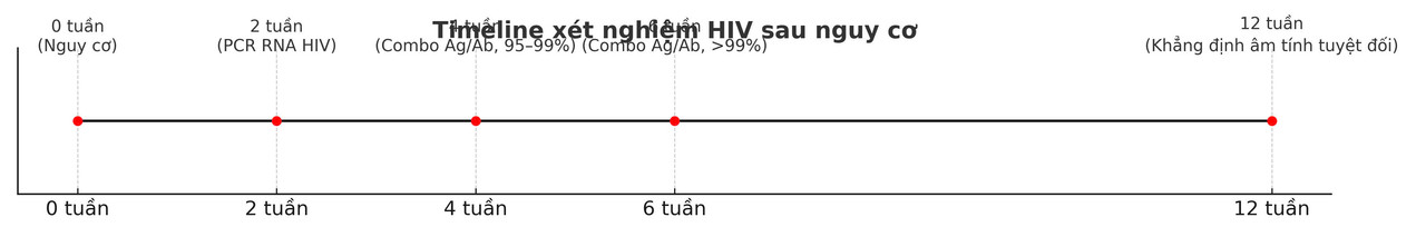 Đây là sơ đồ timeline xét nghiệm HIV sau nguy cơ dễ hình dung các mốc quan trọng để xét nghiệm và khẳng định kết quả.